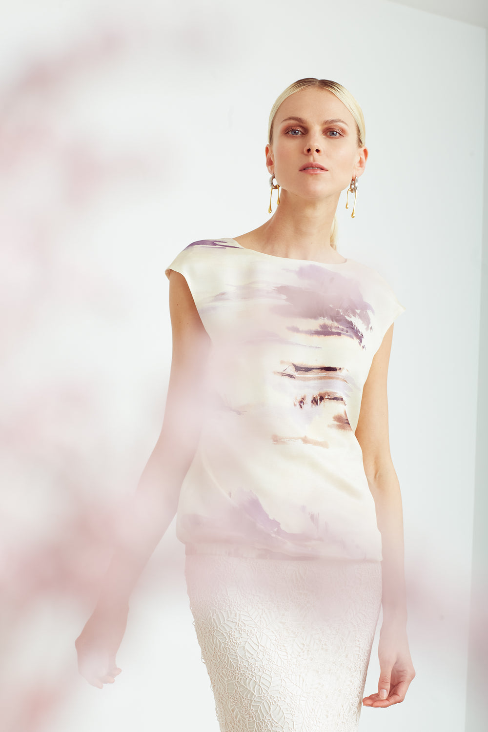 This softly falling top is inspired by one of our bestseller dresses and is made of the finest luxury silk. The nature-inspired slightly shimmering fabric, picturing watercolor strokes in light pastel colors, is woven exclusively for Marimo. An open V-neck at the back and a waistband at the hips add a modern touch to the classic feel of the garment. Pair it with one of our pencil skirts and a pair of heels for a chic dinner look or our wide-leg pants and flats for a more casual feel.
