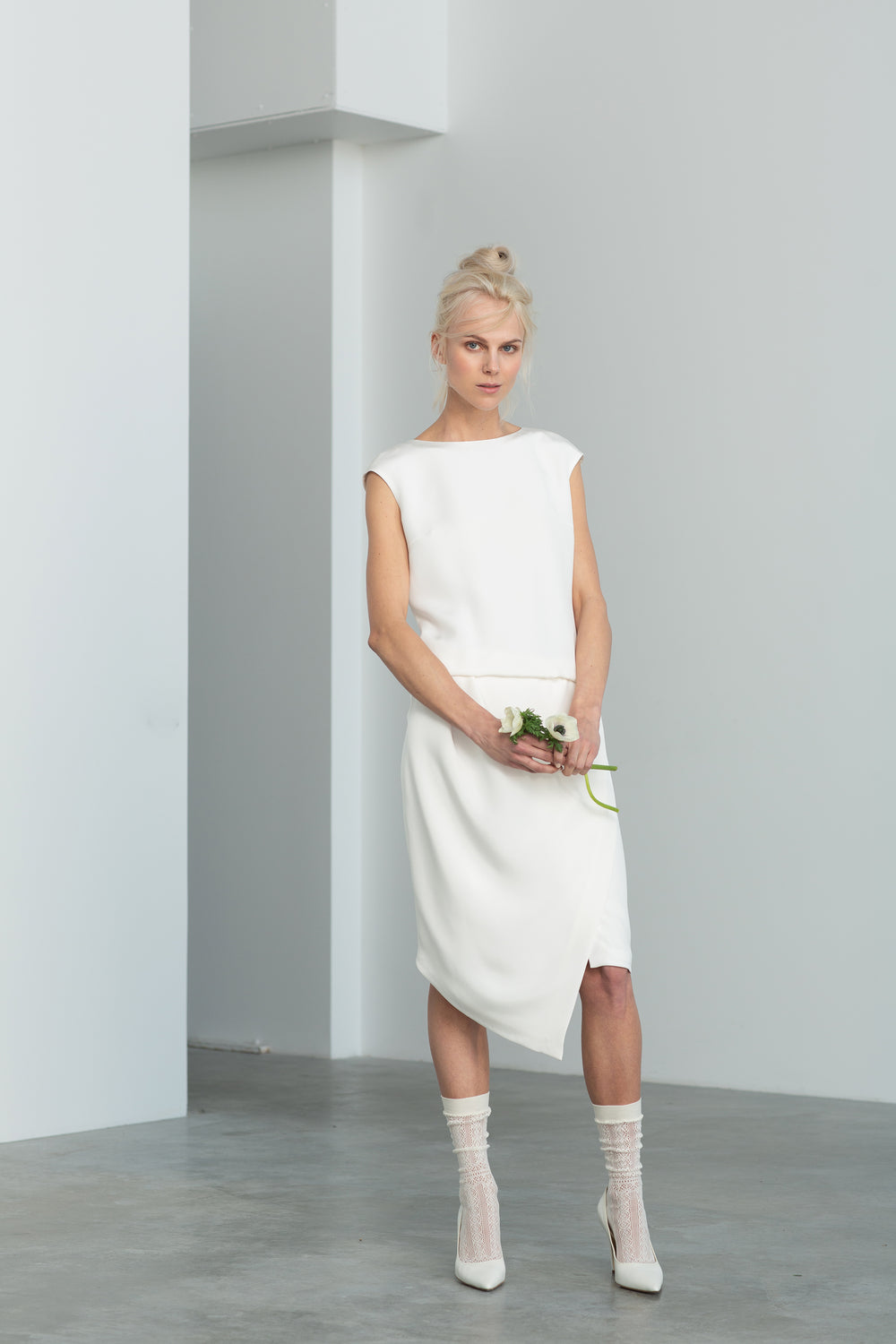 This modern wedding dress is a classy way to express your free spirit. Made of the finest luxury Cady silk, this asymmetrical dress has a low open back with hand-embroidered crystal details. The bodice falls softly on the upper hips and gives you room to feel comfortable while the pencil skirt has a slit in the front that adds a layer of fun to the chic dress. Perfect dress for bohemian style lovers, who would like to add a little luxury to their big day.