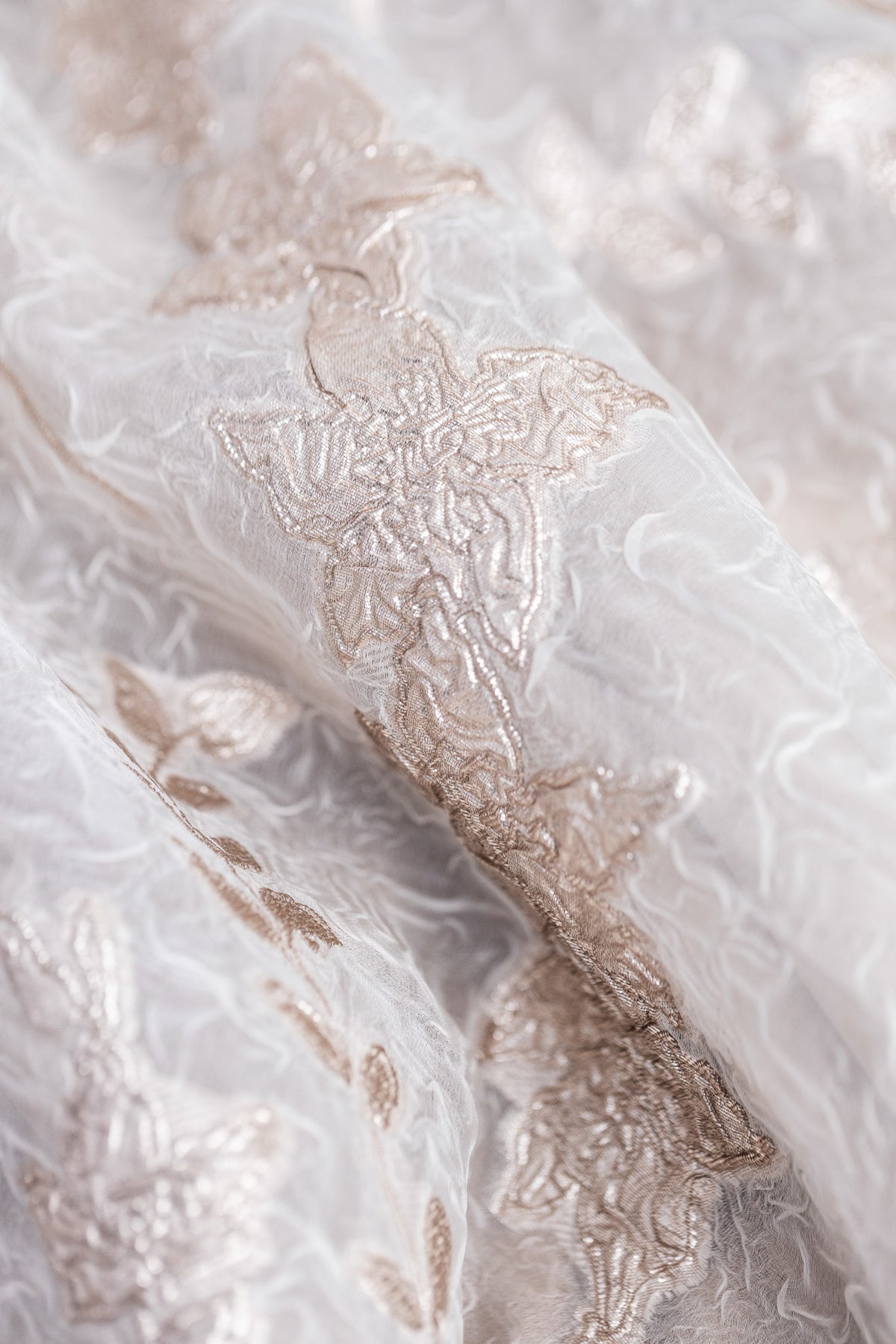 Sheer yet powerful, this jacket captures the light — and attention, with effortless grace. Crafted from a lightweight silk-blend jacquard that combines an organza-like transparency  with a delicate leaf motif in rose gold metallic thread. Cady silk details on the sleeves, neckline, and front lend structure to its airy silhouette, balancing softness with precision. Style it with a matching skirt for a refined ensemble or layer it over a slip dress for a modern, ethereal finish.