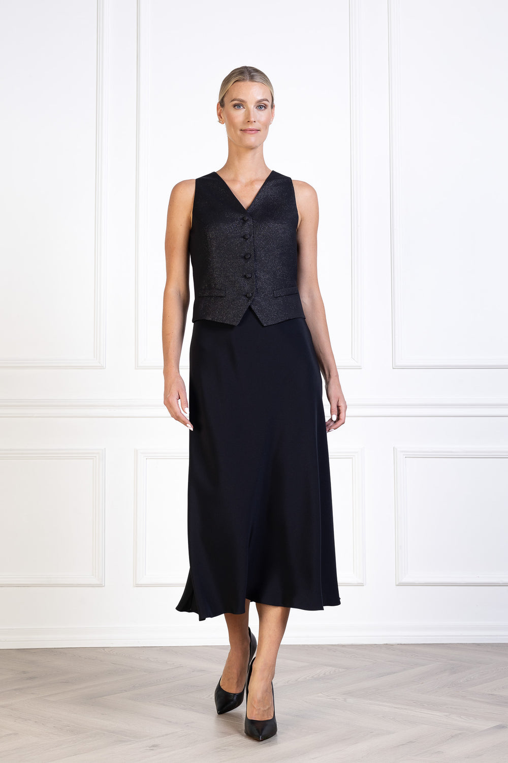 Tailored from fine wool with a subtle shimmer, this vest offers a refined interpretation of a classic wardrobe piece. Designed with a structured silhouette and clean lines, it creates a flattering shape that transitions effortlessly from day to evening. Its minimalist design makes it highly versatile — wear it over a slip dress to give the outfit a new, intriguing dimension, or pair it with wide-leg suit pants for an exceptionally refined and modern look.