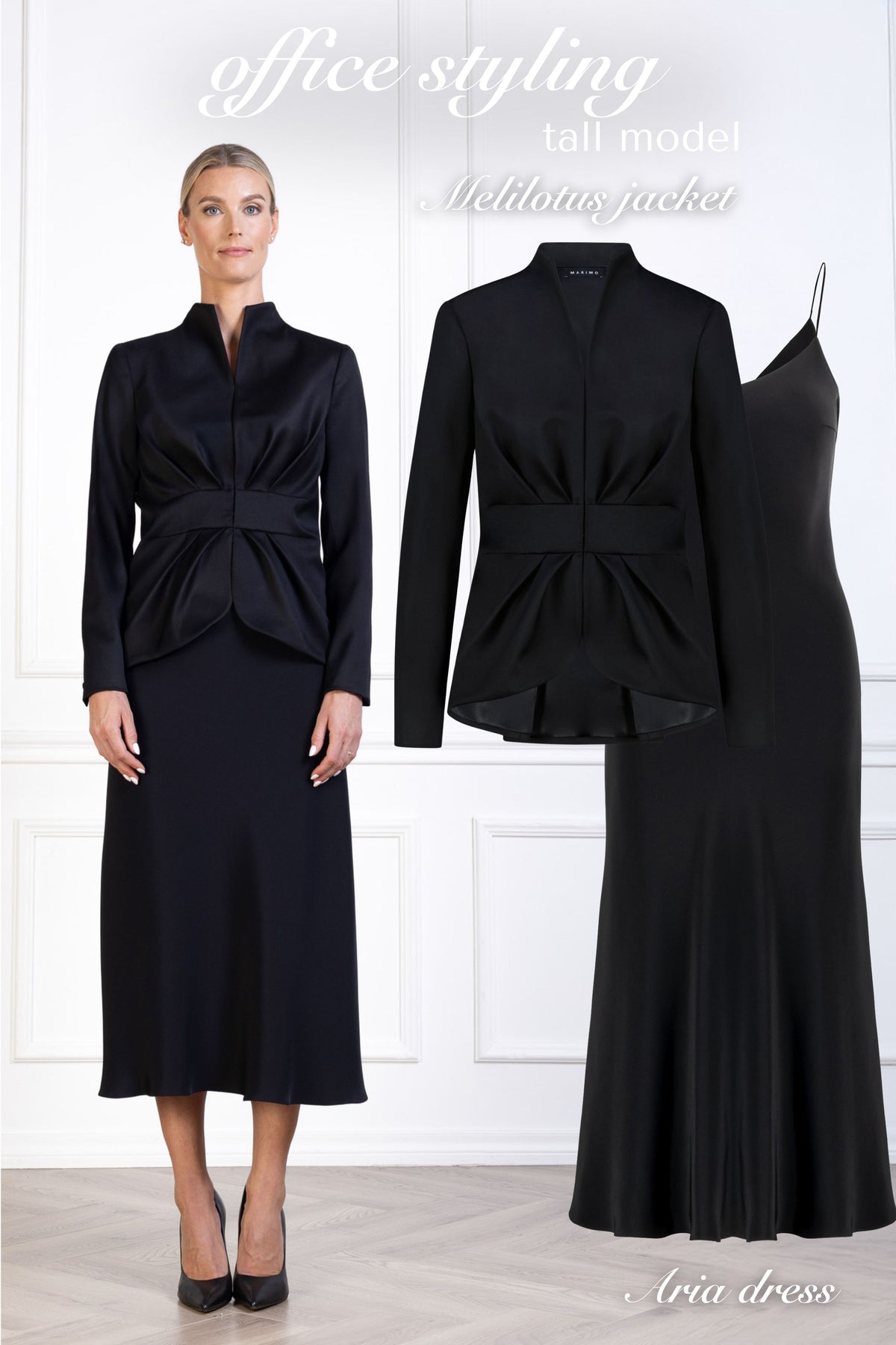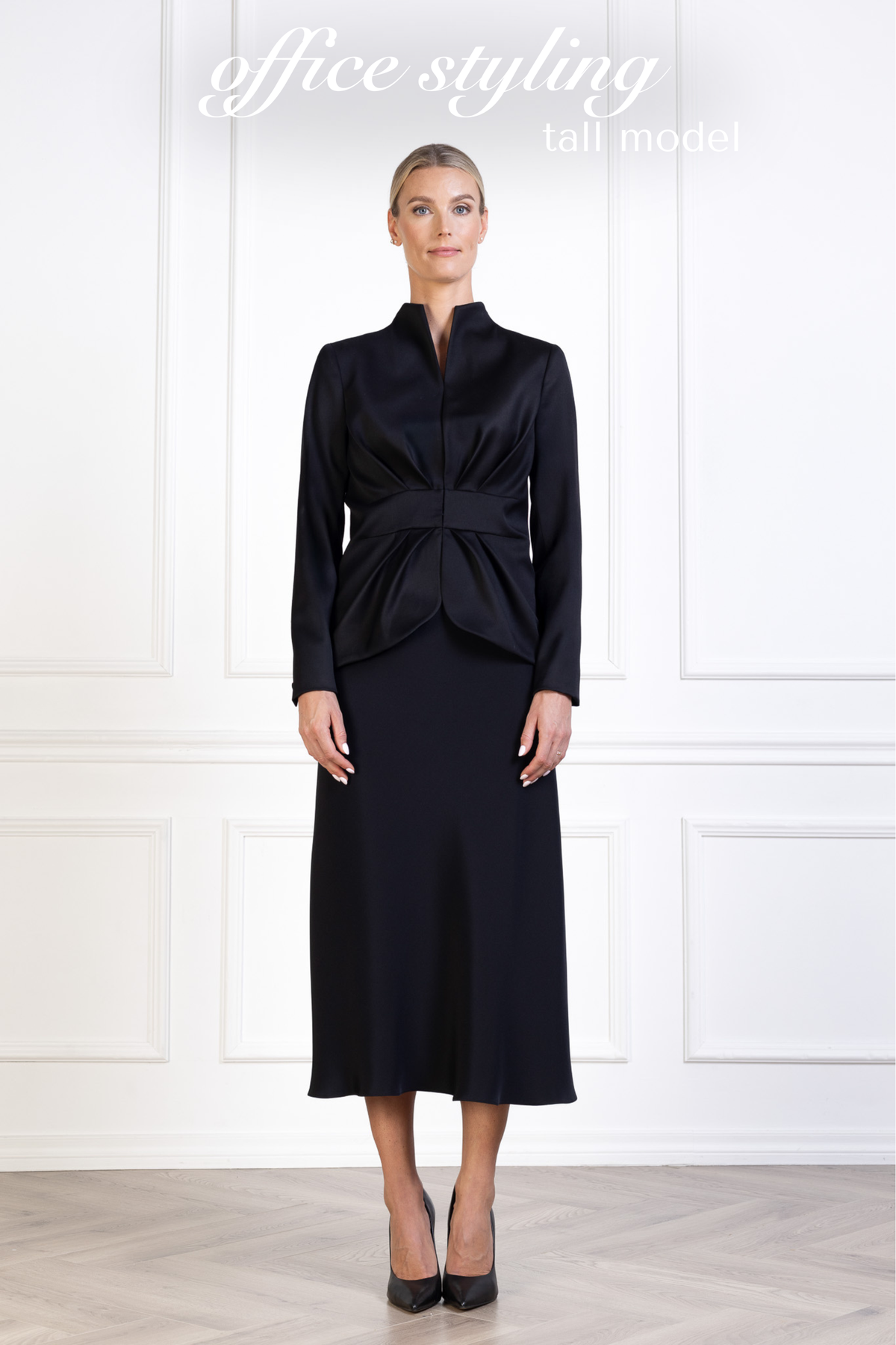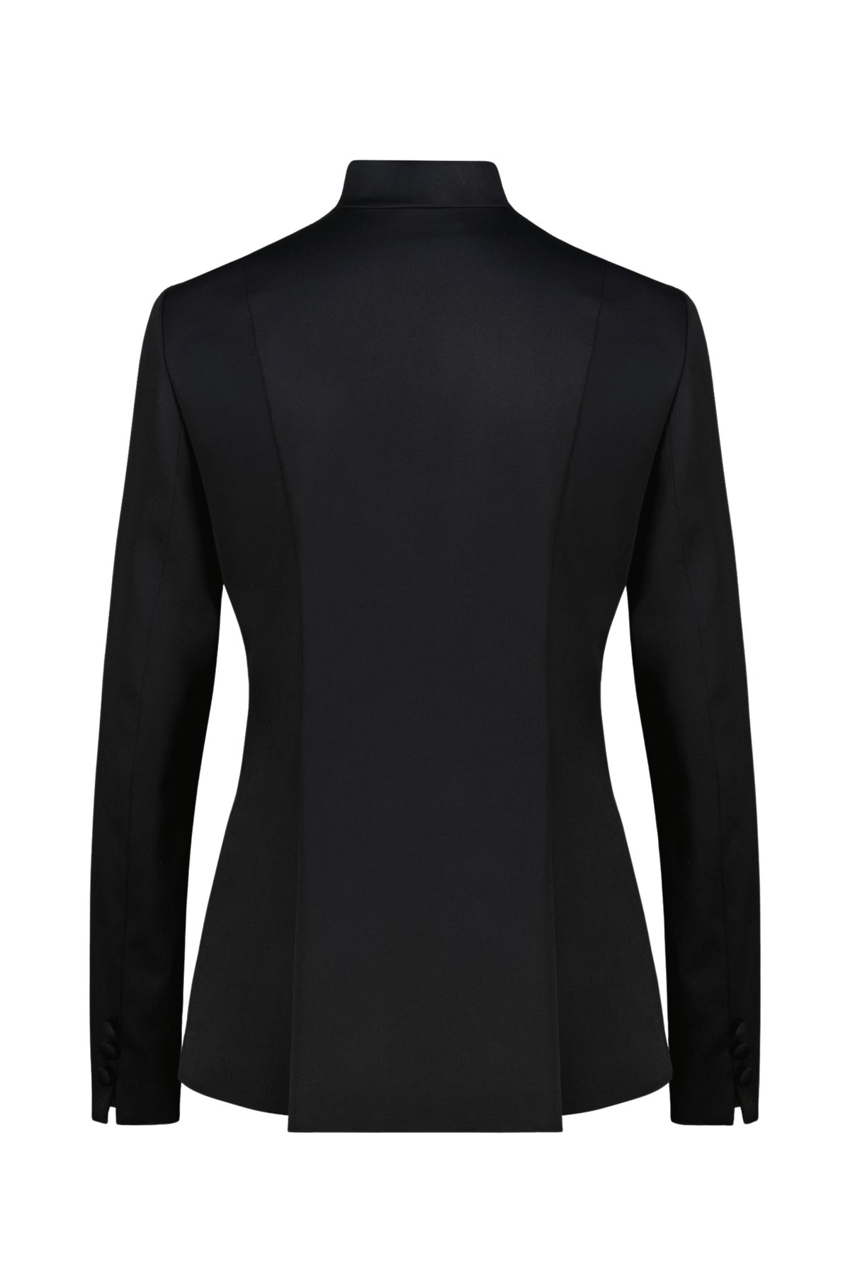 Less is more with this impeccably tailored black fine wool jacket — a fresh expression of timeless sophistication. The sculptural draping in the front enhances the figure, while the stand-up collar adds a touch of elegant confidence. Crafted from luxurious wool with a refined texture, it’s the kind of piece that brings effortless polish to any look. Style it with matching classic trousers for a powerful statement look or soften the look with a fluid slip dress.