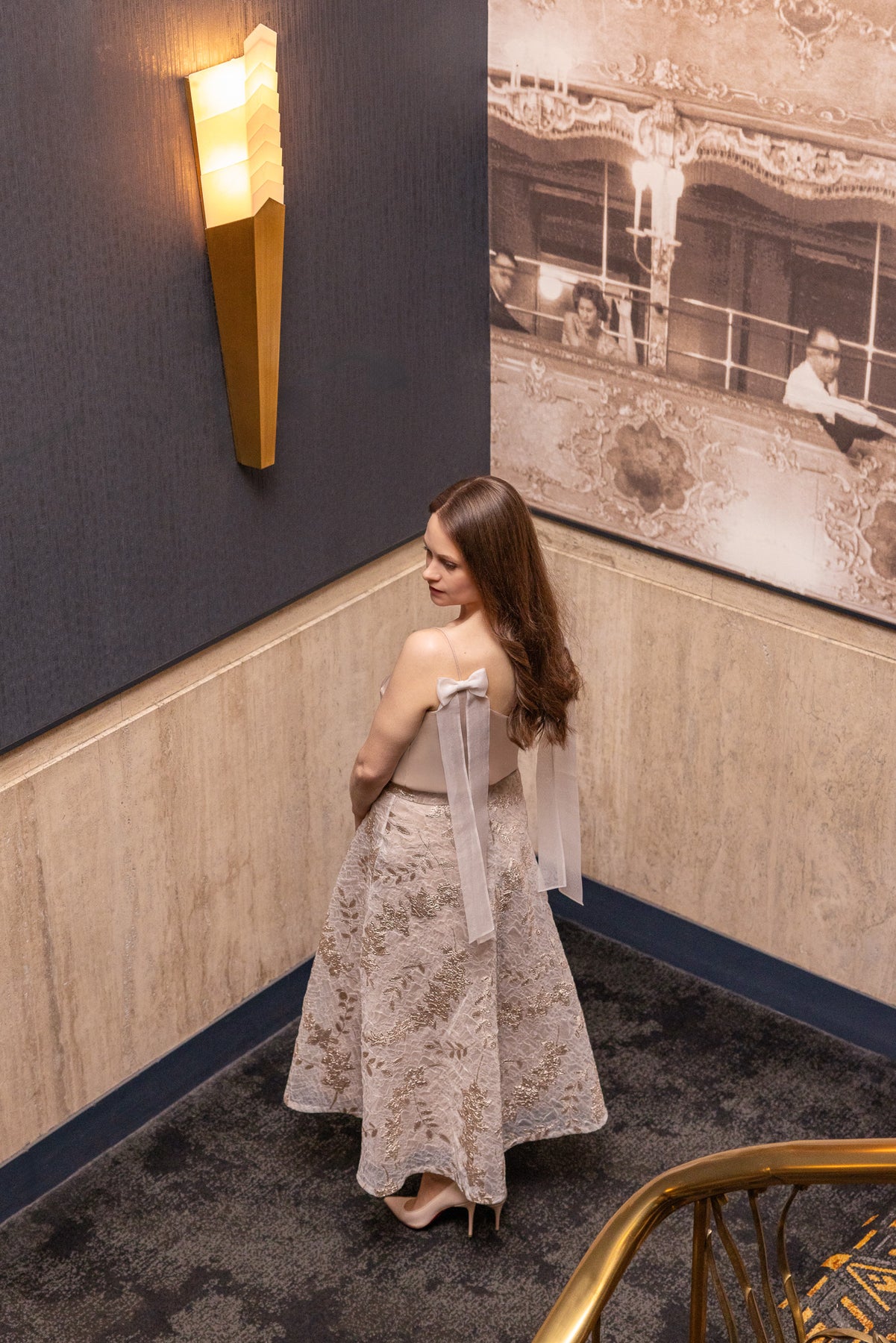 There’s subtle poetry in how this skirt catches the light. Crafted from lightweight silk-blend jacquard that combines organza-like transparency with a delicate leaf motif woven in rose gold metallic thread. The A-line silhouette moves beautifully with every step, striking that balance between structure and softness. Its shimmering finish makes it ideal for special occasions, yet its quiet elegance keeps it timeless. Style it with a matching top for a graceful dress-like look or pair it with a soft knit for an effortlessly refined contrast.
