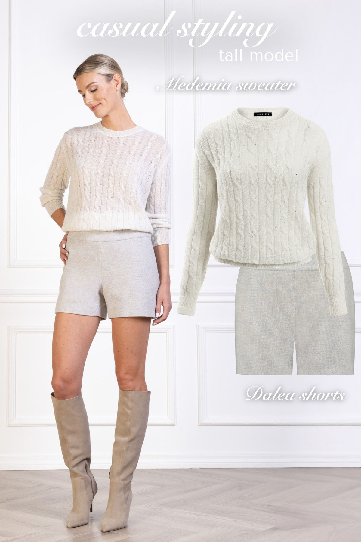 Tweed mini pants are a fresh take on the classic tweed mini skirt look. This luxurious tweed is subtle in shimmer and rich in tone as it reveals glimpses of blue and yellow, merging into one playful shade of gray. The tailored silhouette offers a flattering fit, while the mini length adds a bold contemporary edge. These mini pants effortlessly transition from day to night, making them a fun and versatile piece for any occasion. Wear them with sneakers and a T-shirt for a walk in the park or style them with knee-high boots and a matching top for a casual but chic transitional season look!