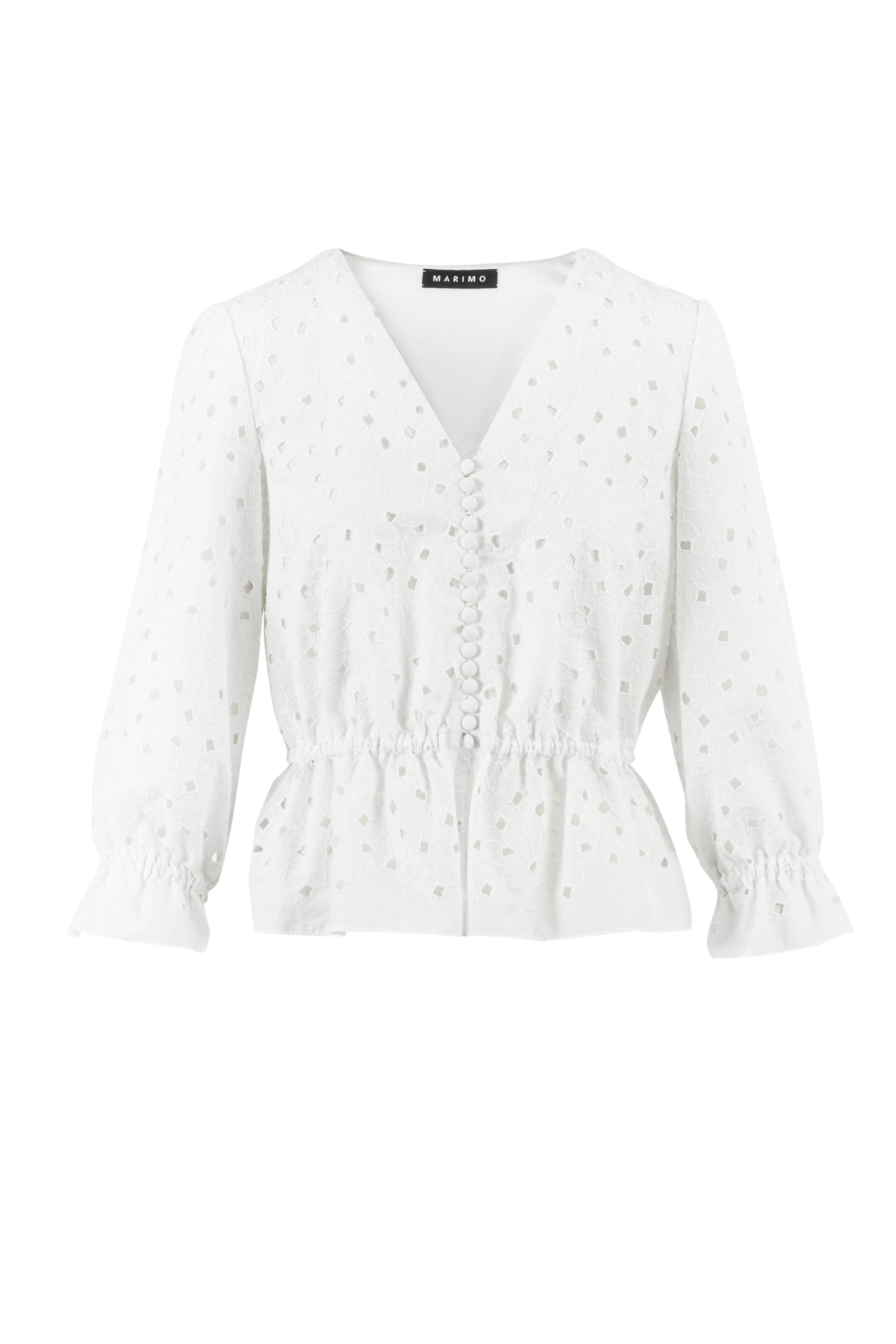 White broderie anglaise is a great look for spring and summer. It is light, airy, and very feminine. This intricate flower pattern broderie adds a touch of romance to this already dreamy top with bishop sleeves and a row of tiny fabric-covered buttons decorating the front. Not to mention, everyone knows peplum is the most figure-flattering cut for any woman to wear! You can easily put together a chic monochrome look with our matching pencil skirt or shorts and style it with a classic pair of heels for your dinner date night or wear it with one of our wide-leg pants or a pair of high-waisted jeans.