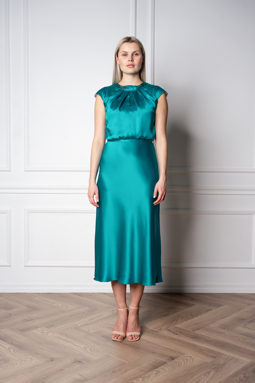 CLUSIA TEAL SILK SATIN MIDI DRESS WITH CRYSTAL EMBELLISHED NECKLINE