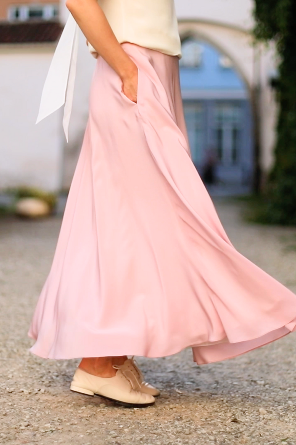 This pink crepe de chine maxi skirt is made for days when you want to feel light, elegant, and effortlessly put together. Its fluid silhouette moves with you, catching every breeze and softening each step. The color radiates warmth and optimism, while the high waist flatters your shape and adds a touch of poise. Pair it with a simple T-shirt or a silk blouse for an easy summer outfit – or elevate it with heels and a crystal belt for late afternoon gatherings.