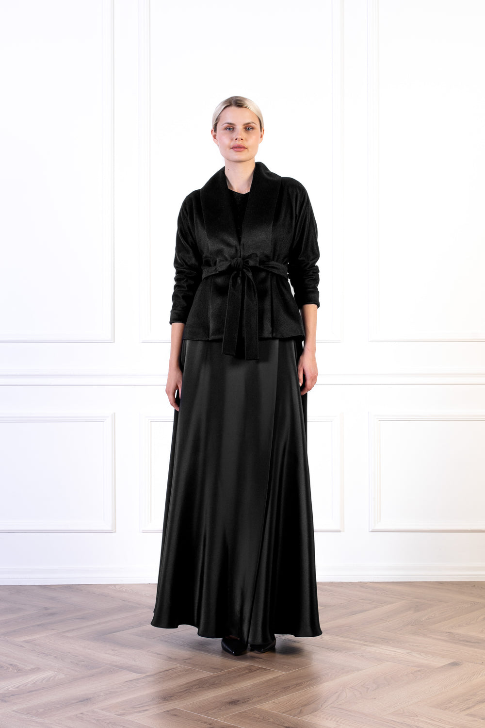 Nothing to wear over your floor-length gala dress? We’ve got you covered. This luxurious cashmere jacket is the ideal choice for layering over maxi-length dresses or skirts, offering both coziness and style. High-quality cashmere is the softest and warmest fabric that naturally helps with regulating body temperature, while being lightweight to wear, which makes this the perfect layer from autumn to spring. The shorter cut beautifully complements a variety of outfits, while the cinched waist with a matching belt ensures a flattering fit. Style it on top of skirts or pants for everyday wear or substitute the cashmere belt for a black crystal belt for a formal outdoor reception! A versatile wardrobe essential, it’s the perfect piece to elevate your look with timeless elegance and comfort, whether for special occasions or everyday refinement.