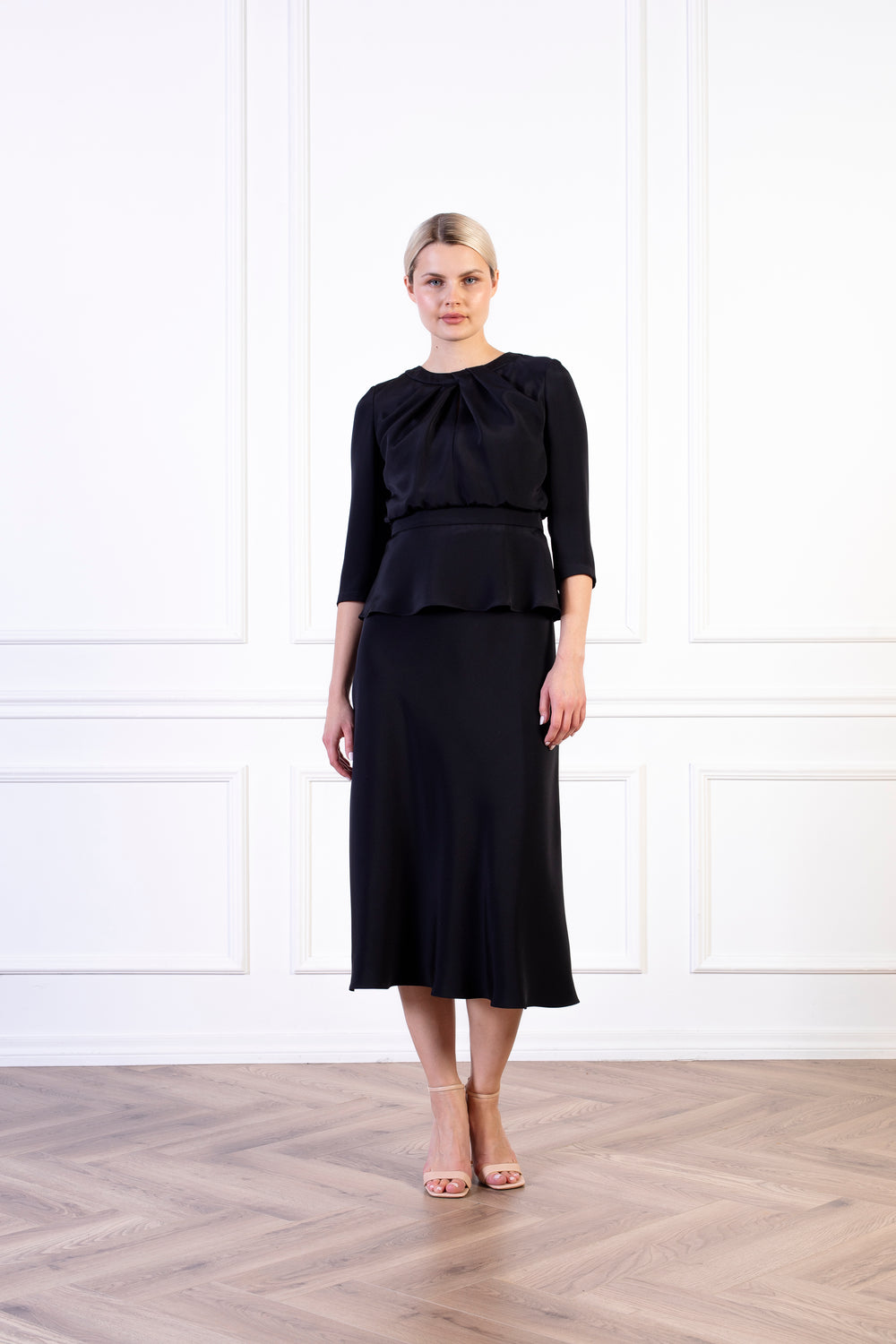 - Fitted at the waist with a softly falling bodice and peplum shape