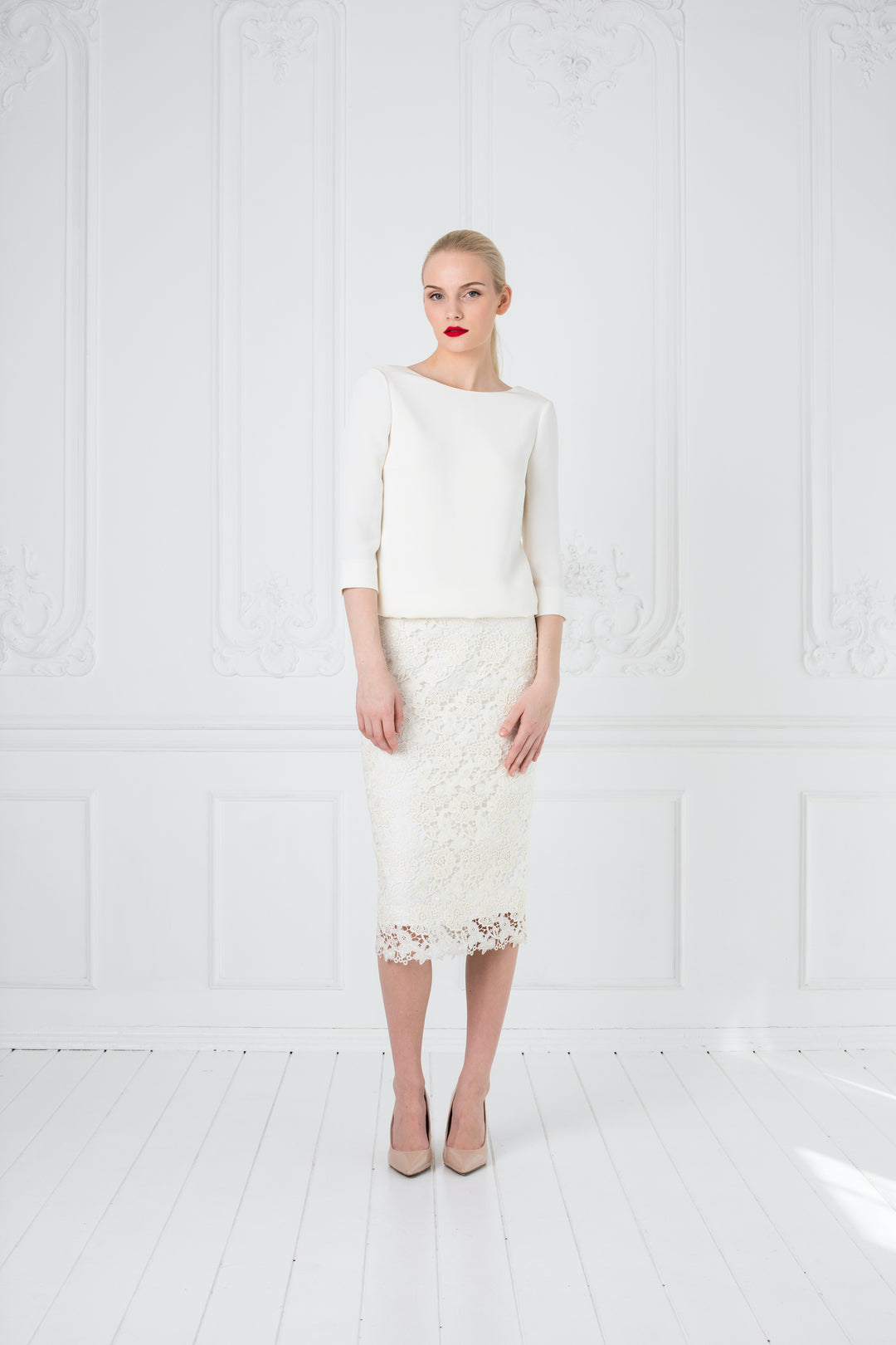 This sophisticated ivory pencil skirt made of macrame lace is very versatile. It has a white fabric underneath the lace and a silk lining that feels super smooth against the skin. Fabric-covered buttons at the back add a clean and elegant detail. Wear it with blouses of different shapes, and black tights in the winter months. But for that stunning classy vibe style it with our silk wrap blouse and a pair of heels. It’s the perfect item for both summer and winter!