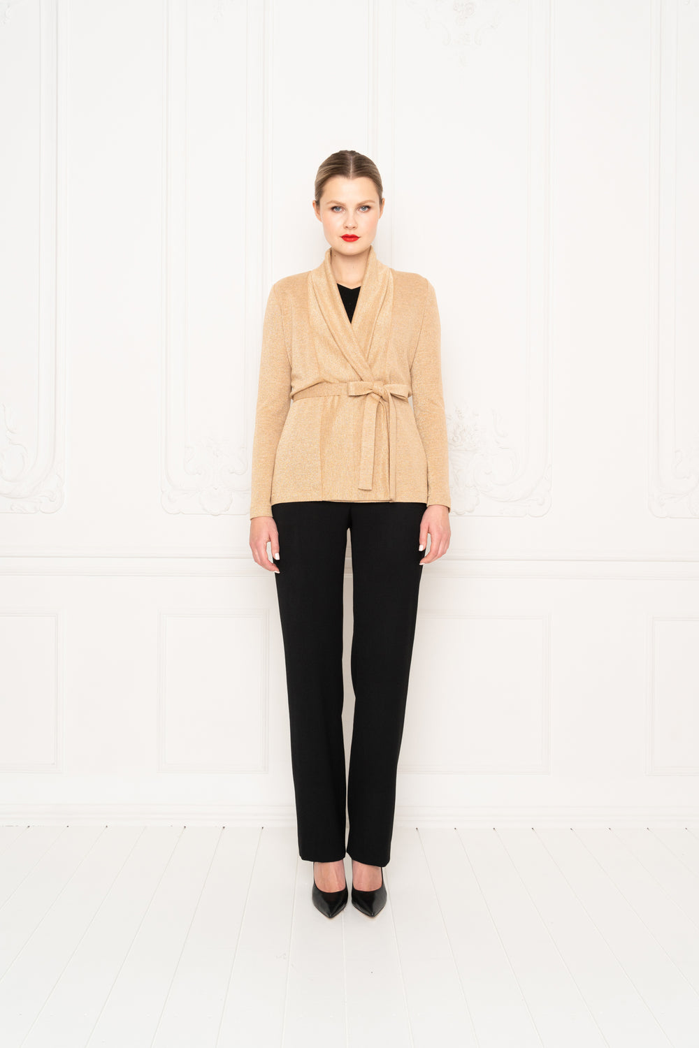 This glamorous golden, slightly glittering viscose-blend cardigan with a flowing collar comes with a belt. The stunning fabric turns this classic cut into something exclusive that can complement your simple day look by adding that touch of luxury and is a perfect fit for your night out or a work function. You can pair it with your favorite jeans, pants, skirt, or dress.