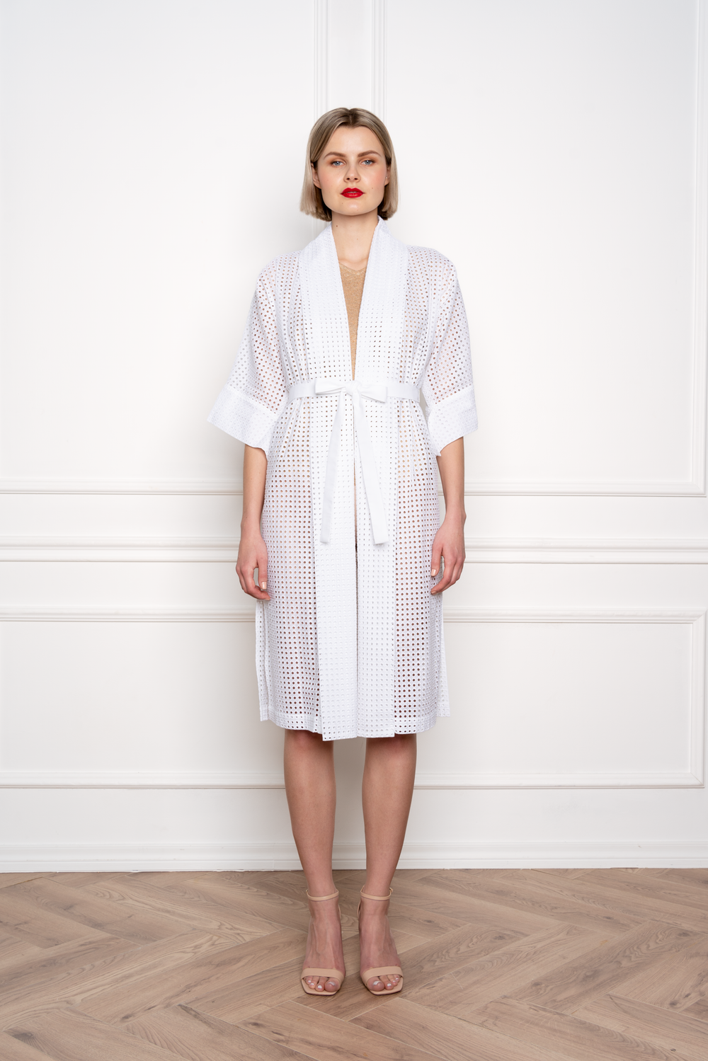 Meet Dadisca - a lightweight long broderie anglaise cover-up that’s a little bit kimono, a little bit dress and a lot chic. It is light, airy, and very feminine. This square geometric pattern broderie leaves an effortlessly luxurious impression and makes you dream of your next resort vacation while the casual robe silhouette creates a look that is both fresh and modern. This piece is what you want to wear on your resort holiday over your swimsuit by the pool or style it with a pair of jeans or casual shorts to have a comfortable day sightseeing or just running errands on your day off. When layering this on top of a simple slip dress, tie it in a nice bow, put on a pair of nude heels and you’ll look chic and put-together for dinner without having to put in a lot of effort.
