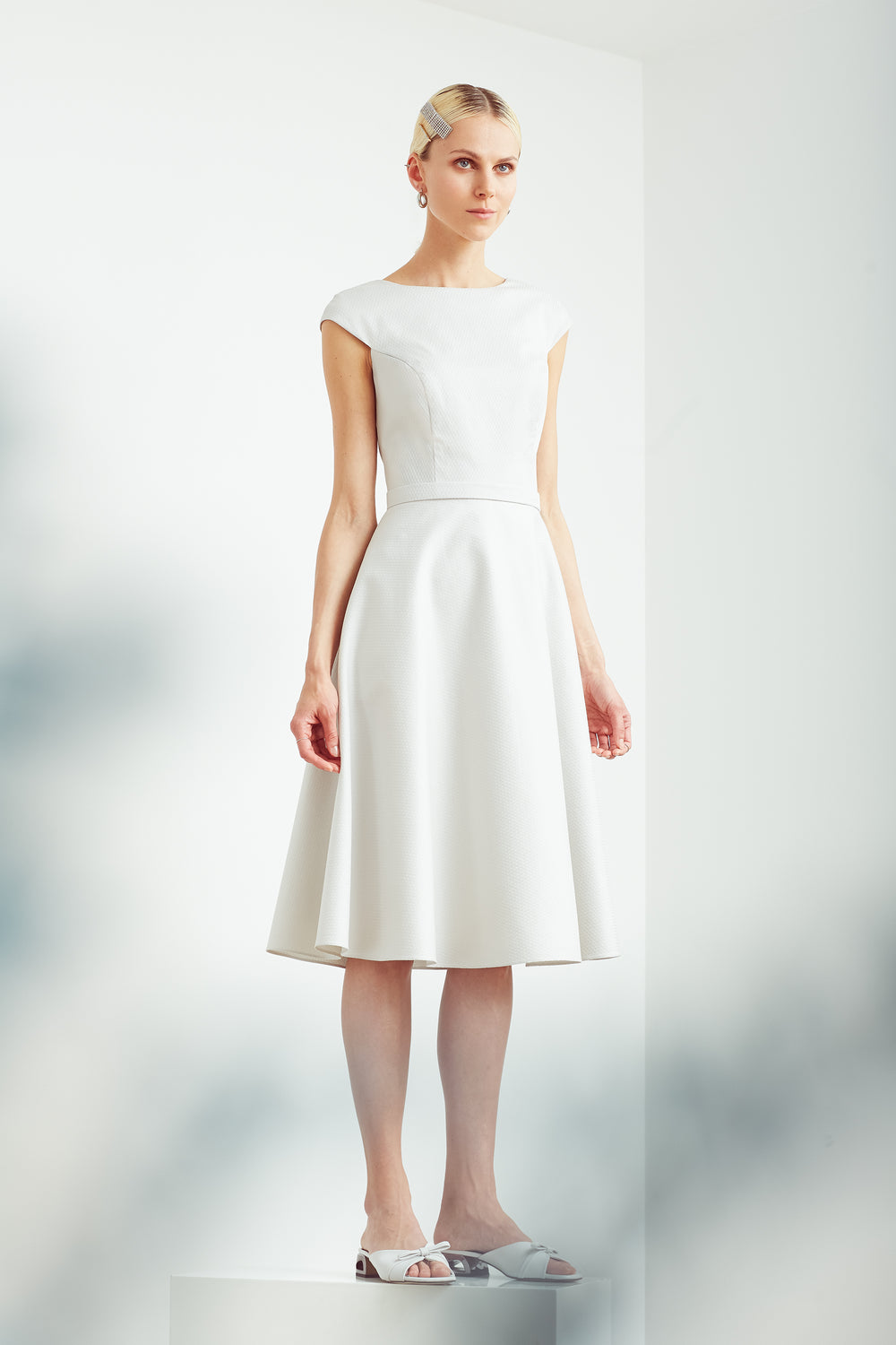 - Designed to be fitted at the bodice with a loosely cut skirt